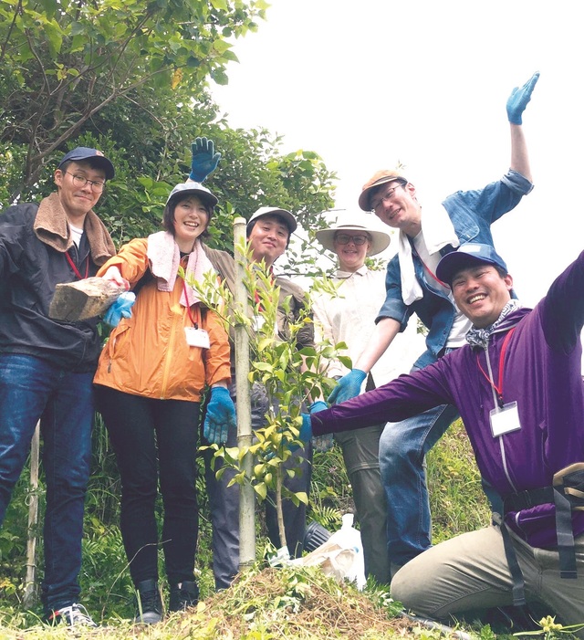 段々畑にはるみの苗木を植樹。「木を植えるとその後が気になりますよね。ただ単に草刈りや清掃をするだけじゃなくて、こうして楽しみながら未来へつながる取り組みをプラスしています」。