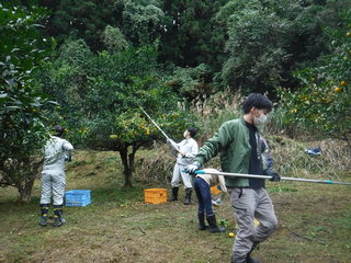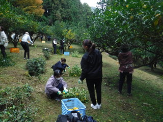 作業に入る前にふるさと団体の担当者からは、「ゆずにはトゲがあることや、剪定ばさみや高枝ばさみを使うことなどから、けがをしないよう十分気を付けること」との説明がありました。新型コロナウイルス感染防止対策を講じつつ、ゆずの収穫や運搬の作業を行いました。