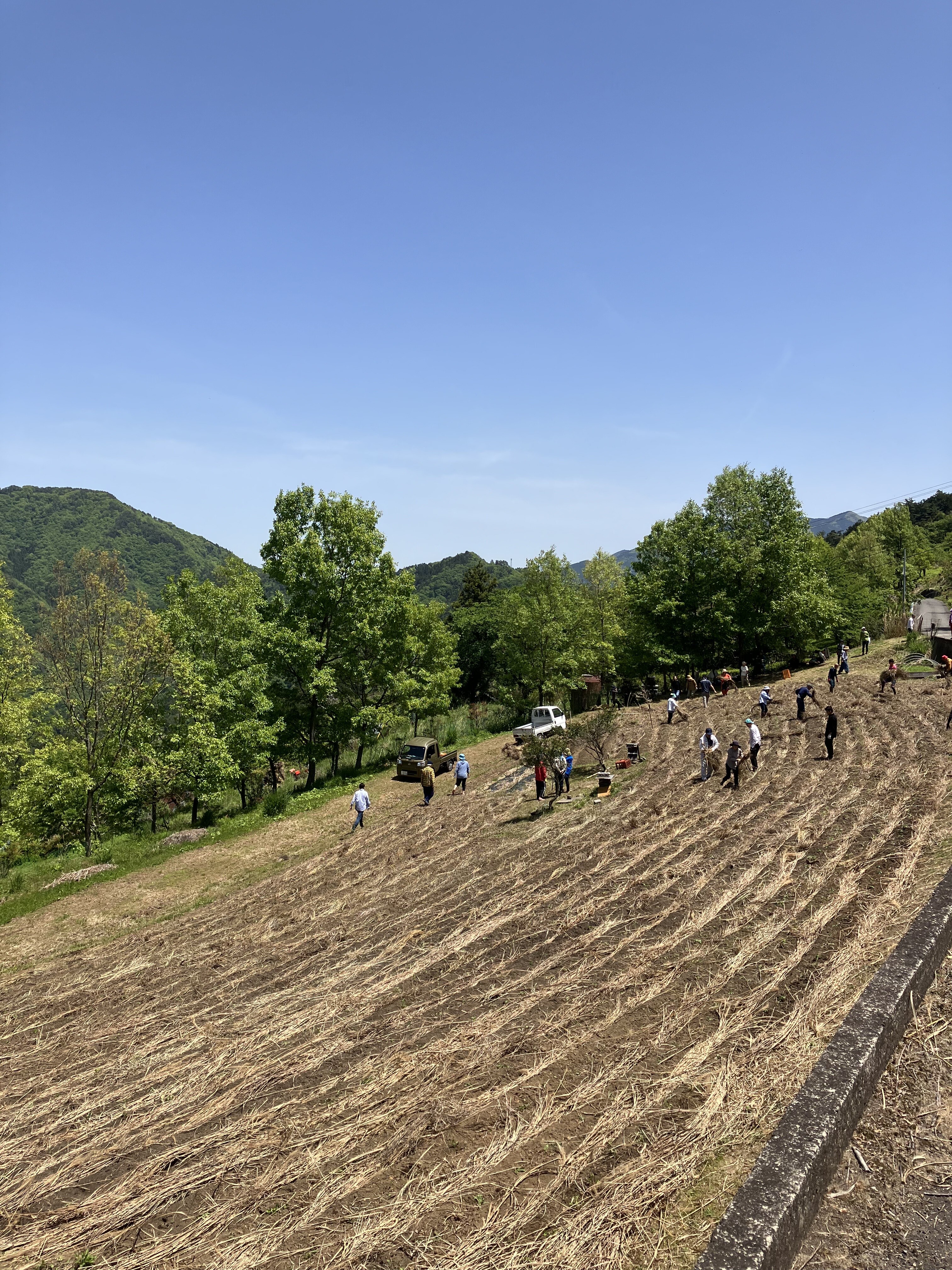 ふるさと団体と協働パートナー合わせ50名程度が藍畑に集まり、山あいの集落に活気が満ちました。協働パートナーはふるさと団体に定植方法を教わりながら、10cmほどに成長した藍の苗を40cm間隔で畑へ定植しました。その後コエグロを4つ解体し、出てきた藁を畑の畝に敷くお手伝いを行いました。