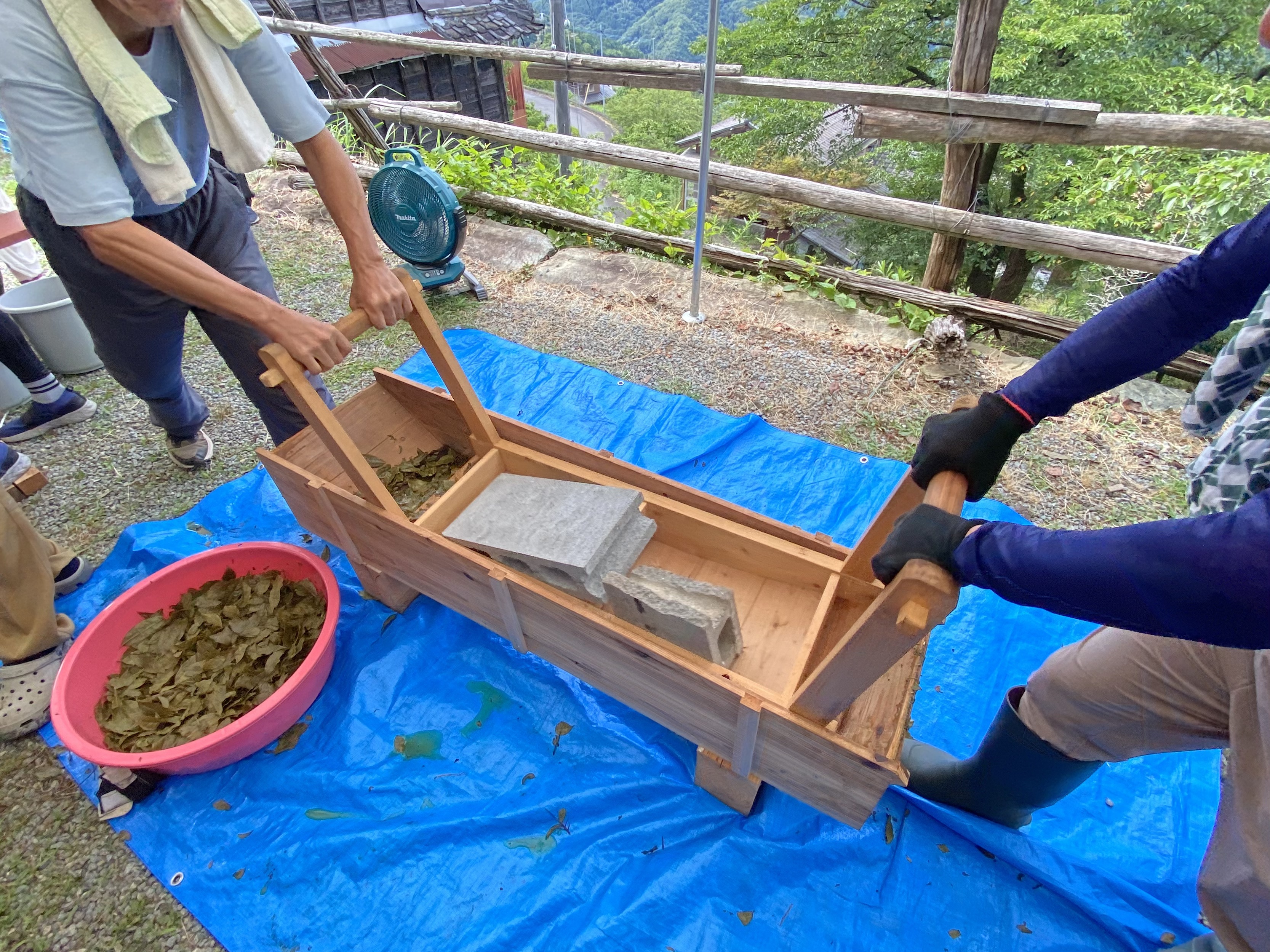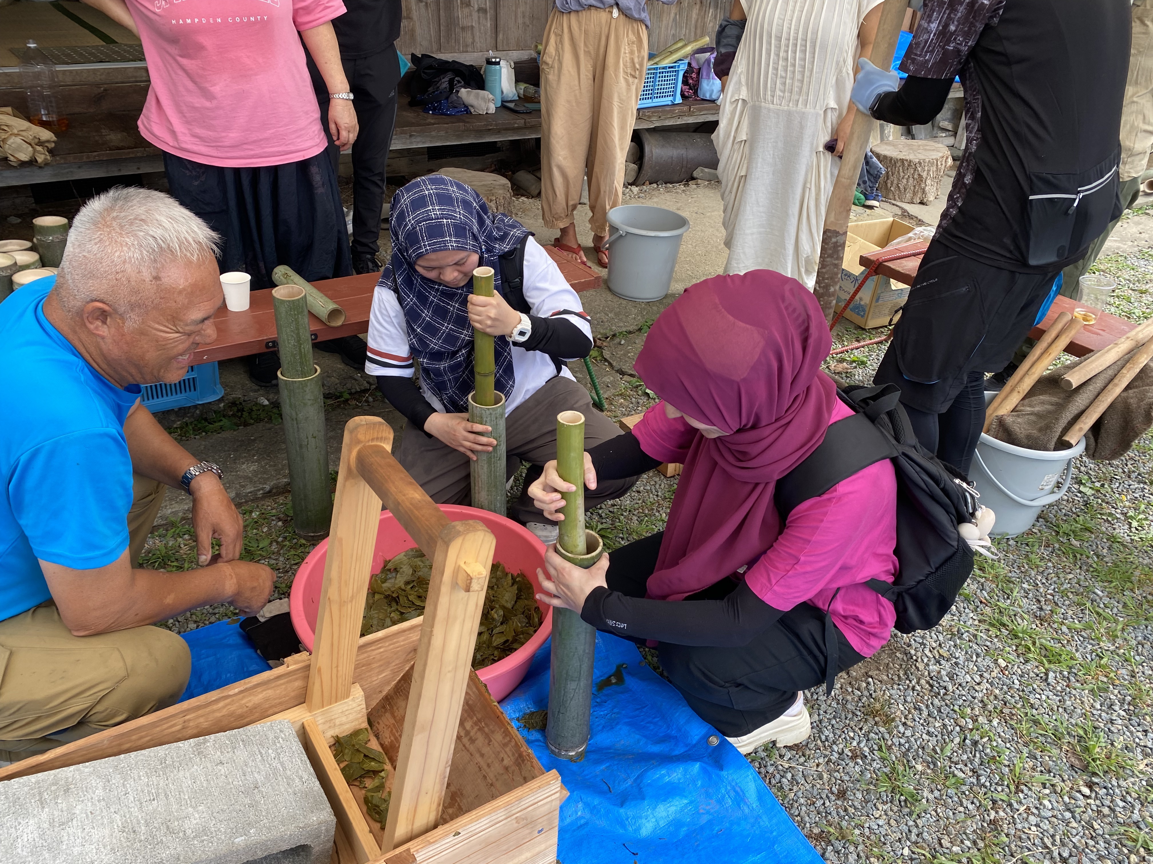 午後からは蒸した茶葉を専用の人力機械で擦り、竹筒に詰めて押し固める作業をお手伝いしました。