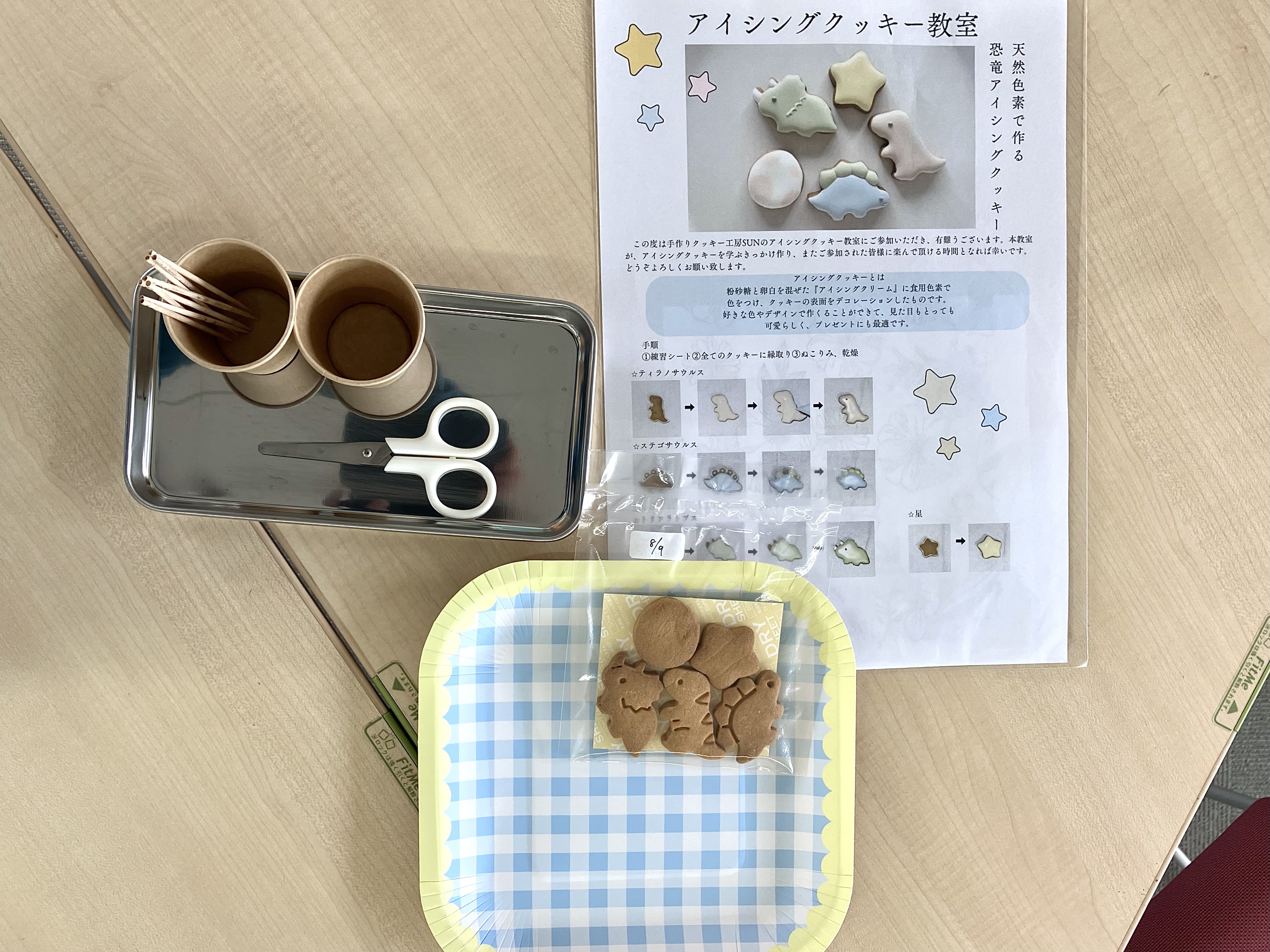 ワークショップの参加者は、準備されたトリケラトプスやティラノサウルス、プテラノドン、たまご、星の5つの素焼きクッキーを講師の準備した手順書に従いアイシングクリームで飾り付けました。