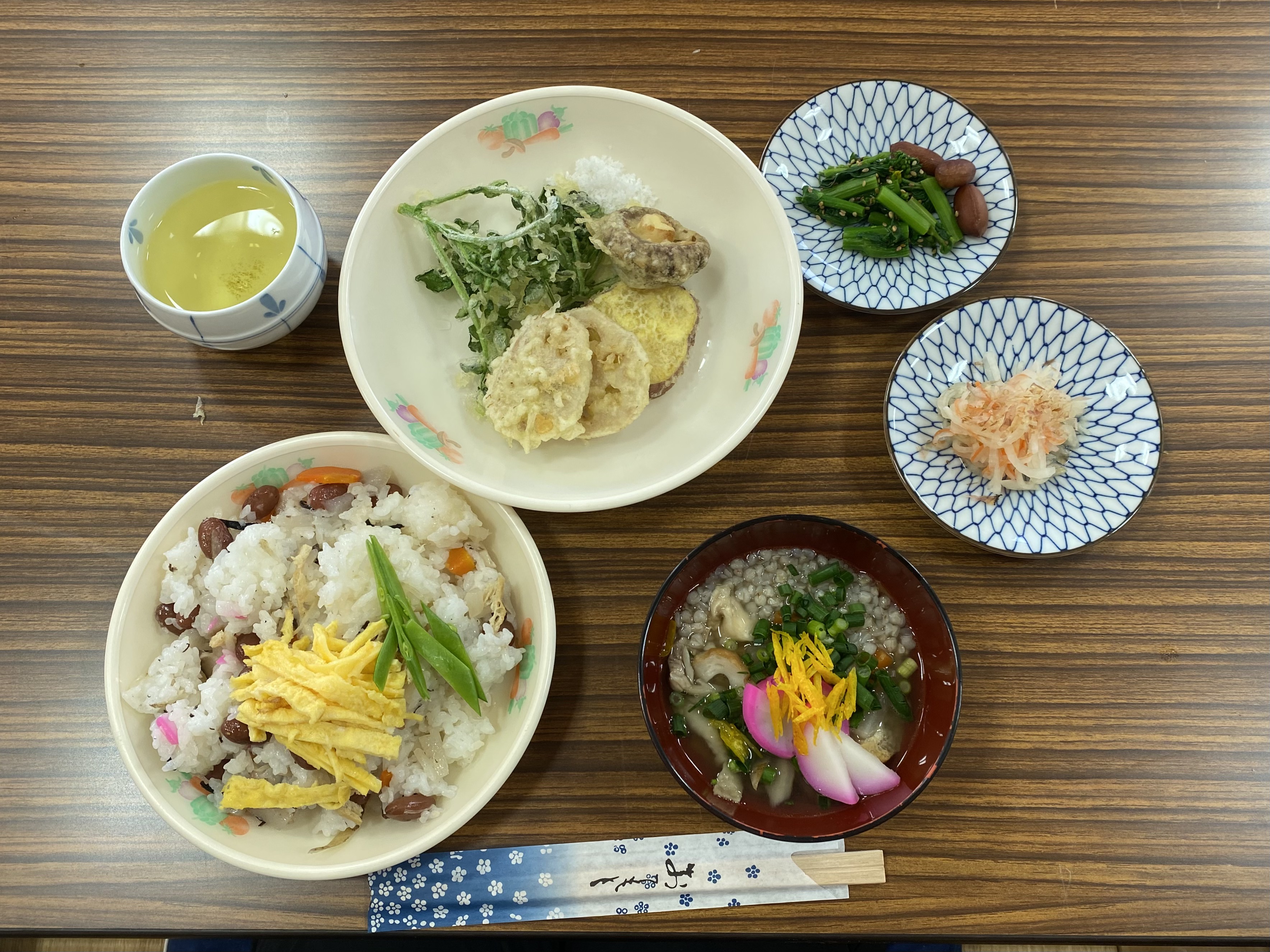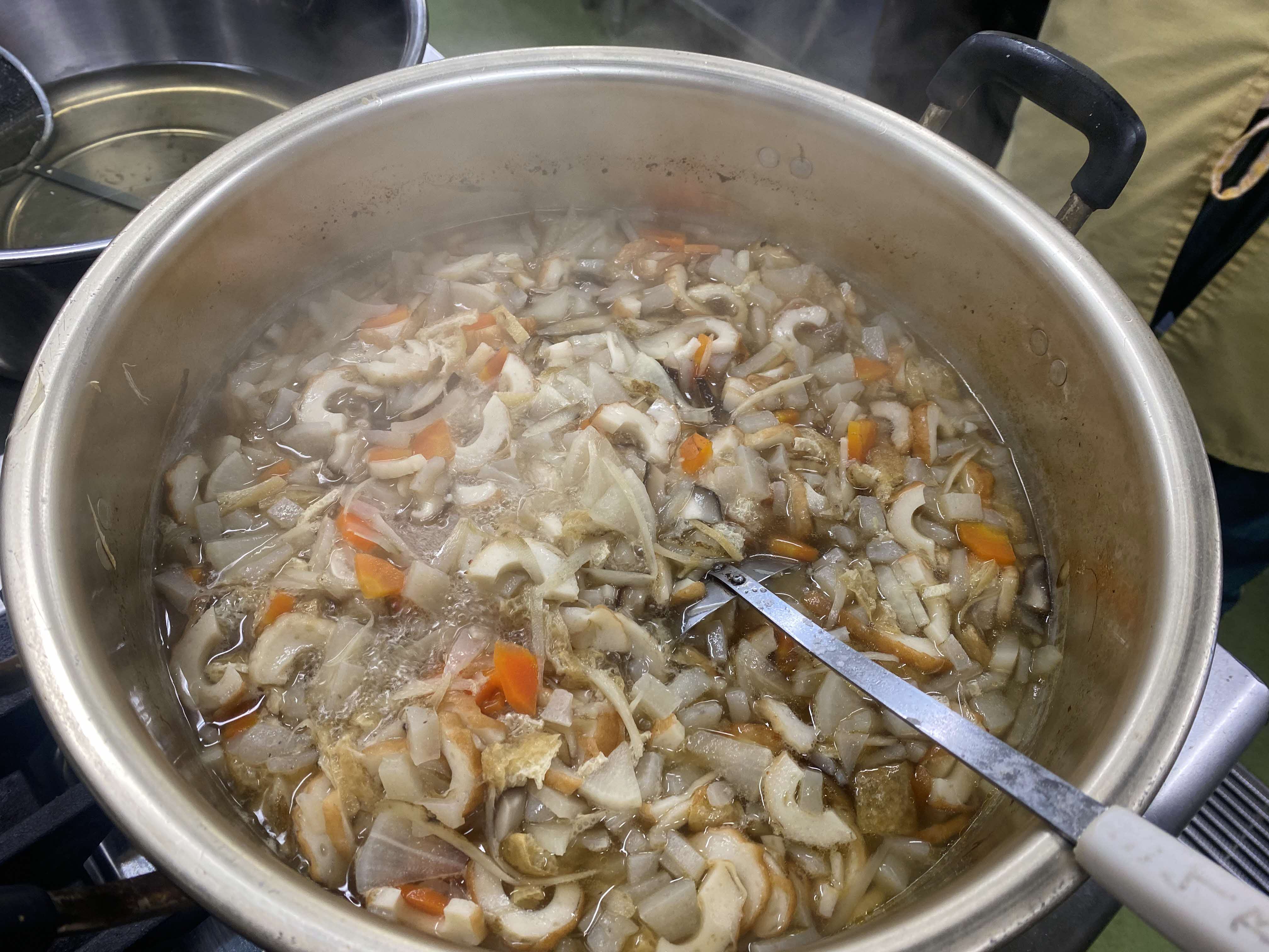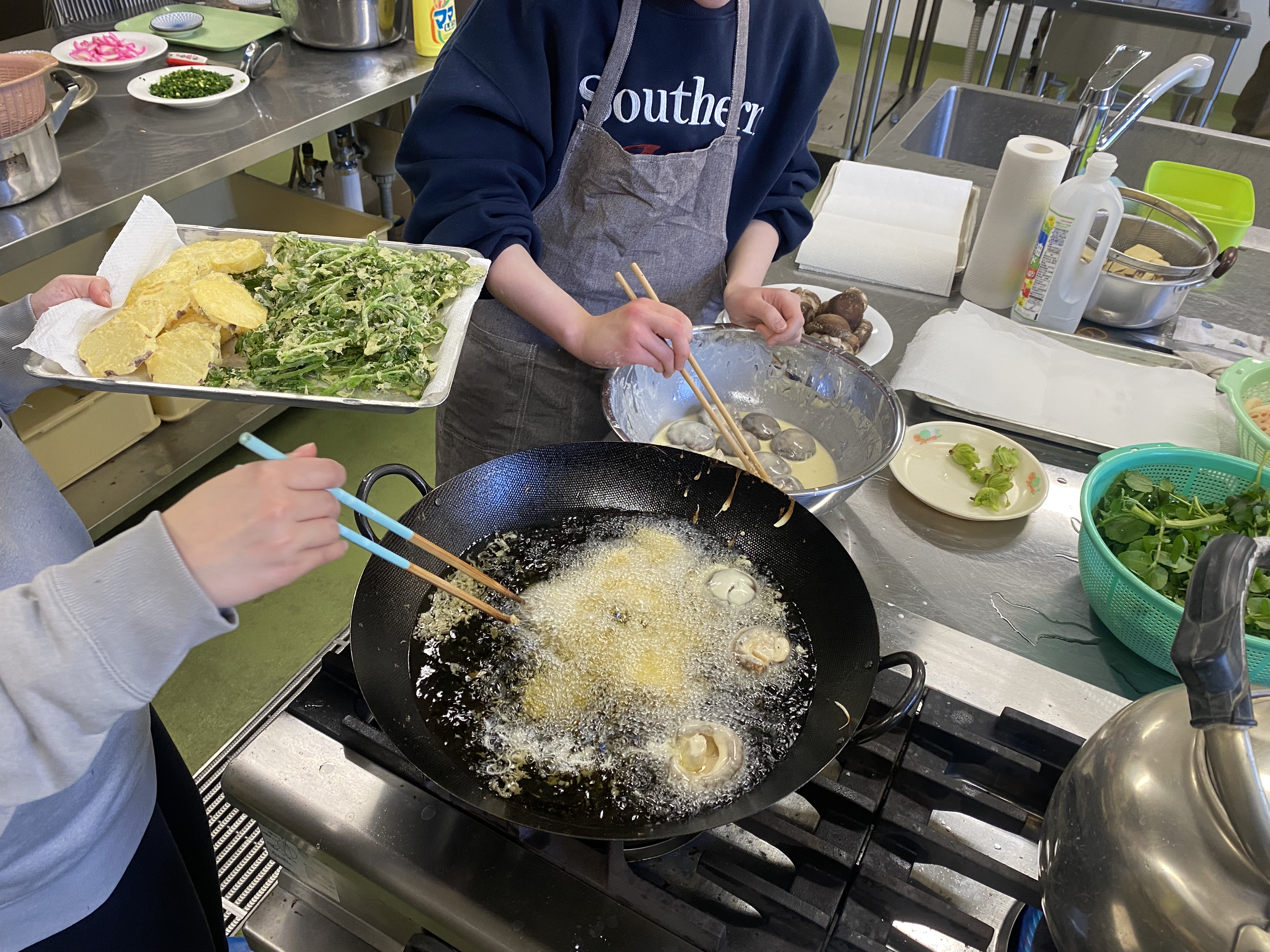 午前中は郷土料理である「かきまぜ」や「そば米汁」、那賀町の産物で作った「天ぷら」を作りました。